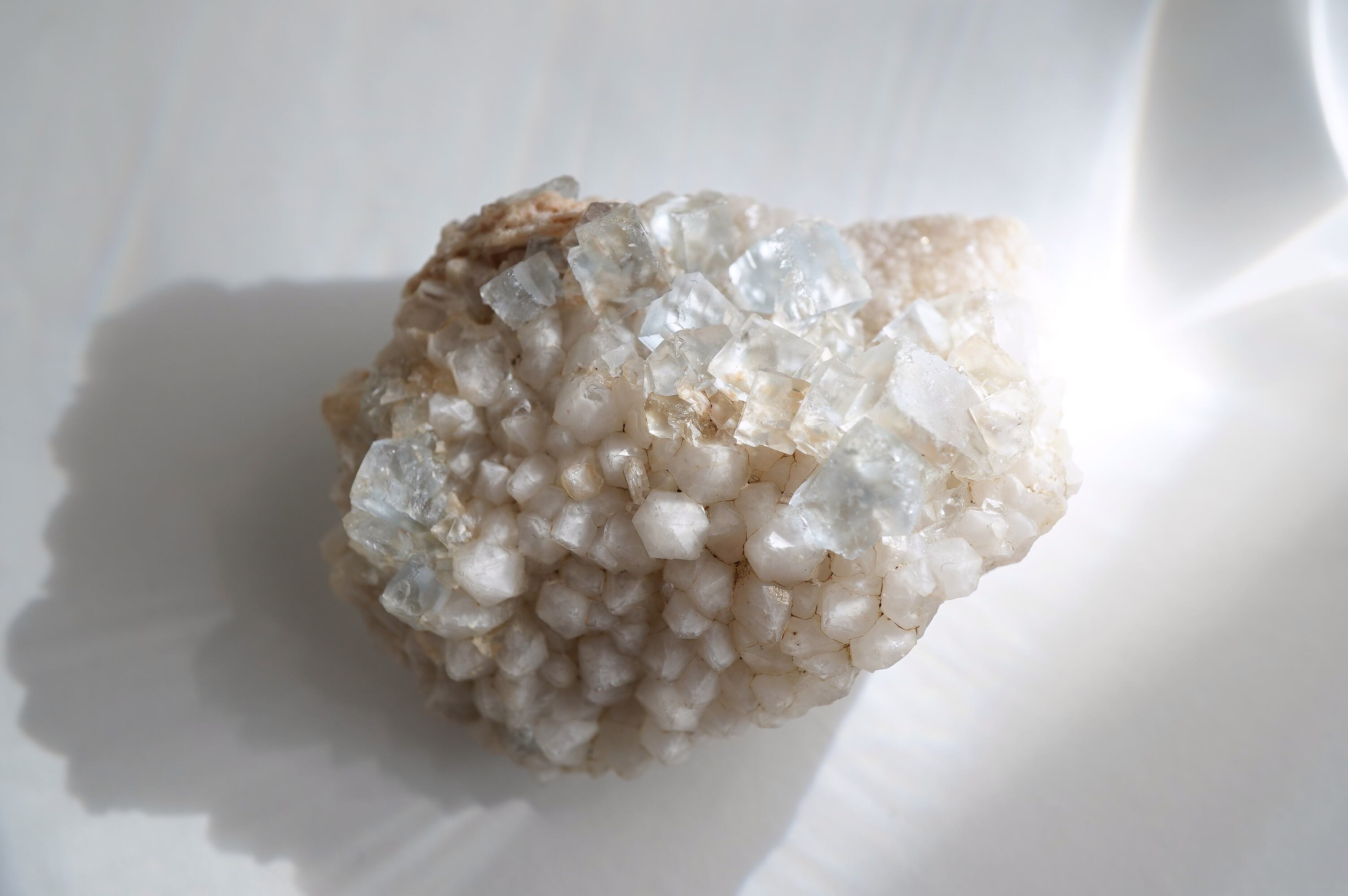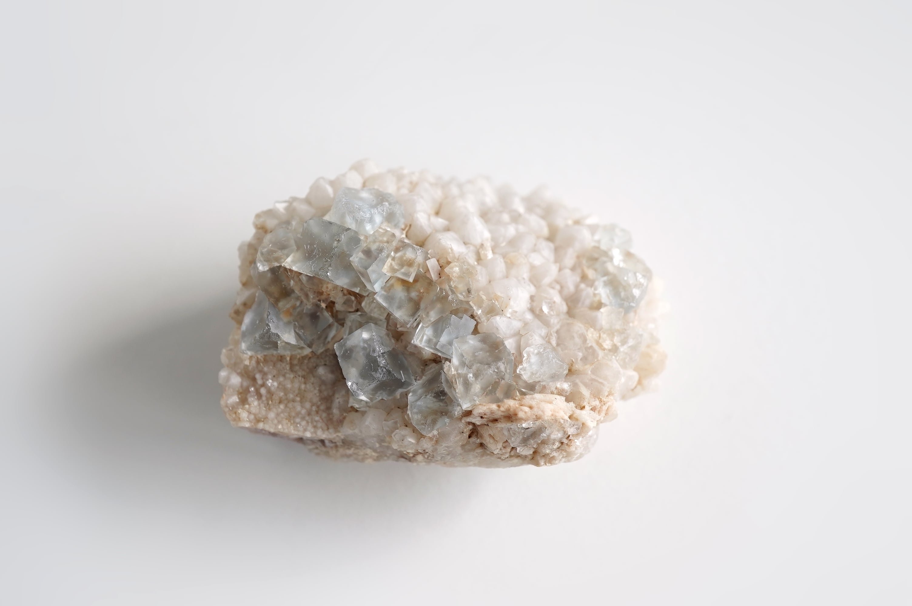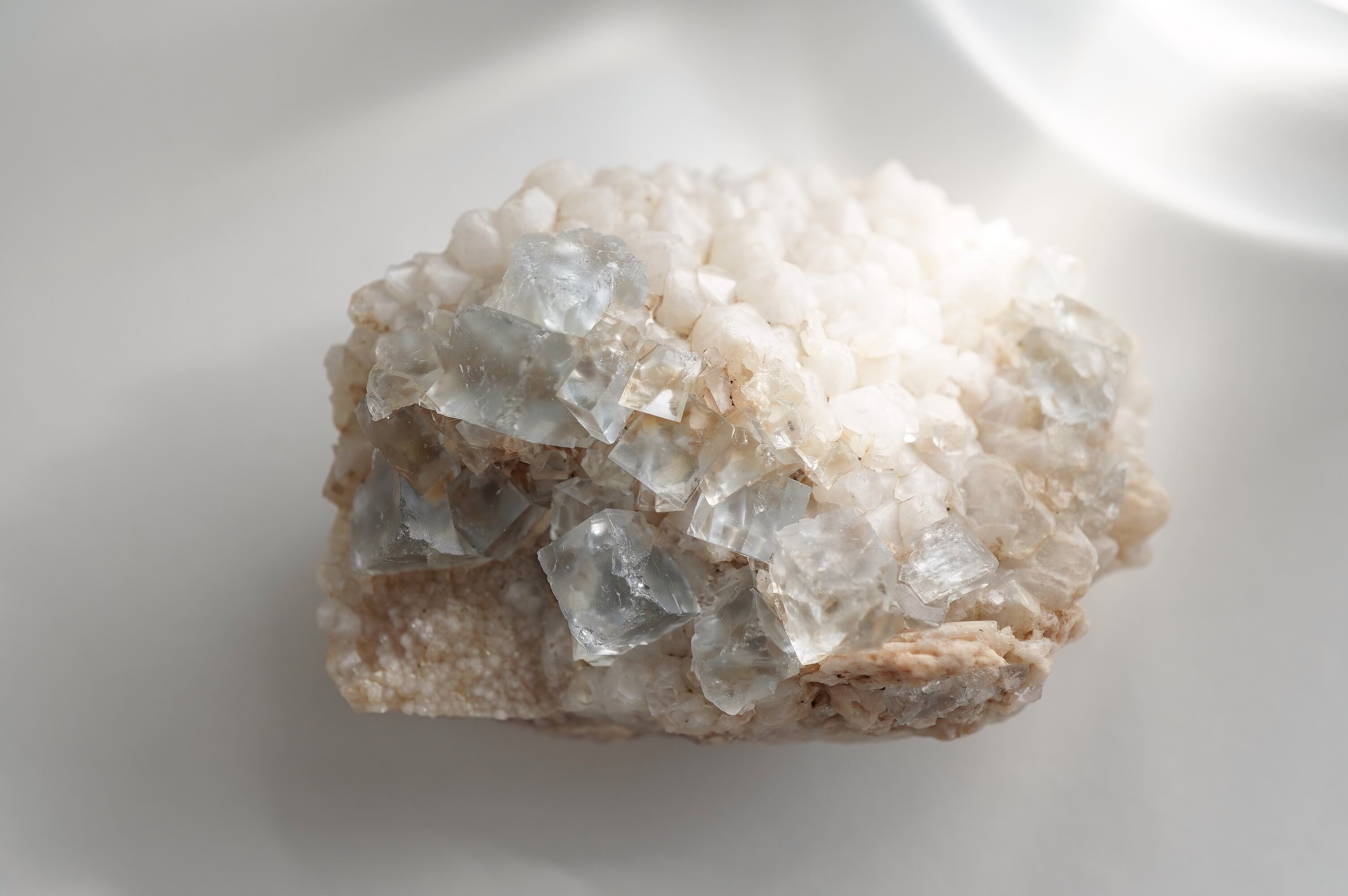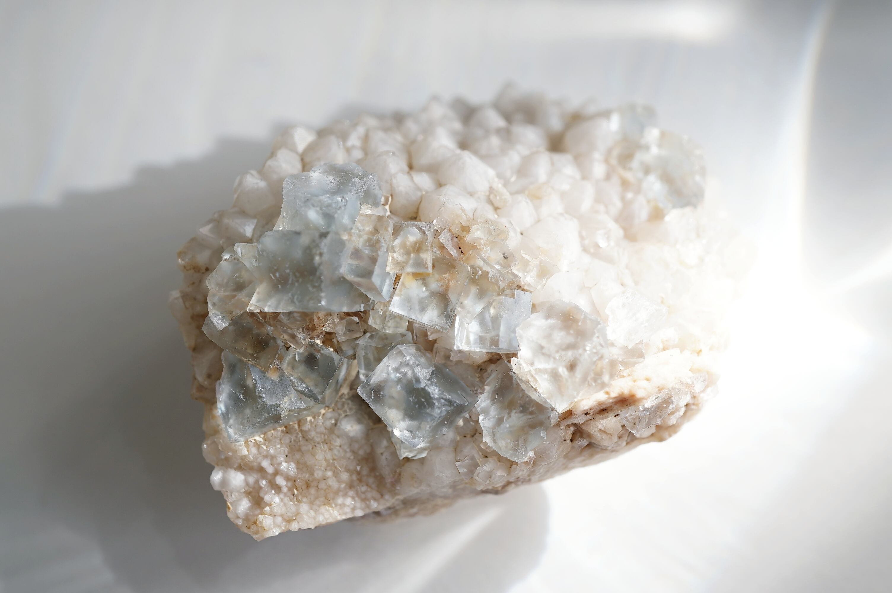 とっても淡いブルーのフローライトにとげとげで白い乳白色の水晶が共生した個体です。