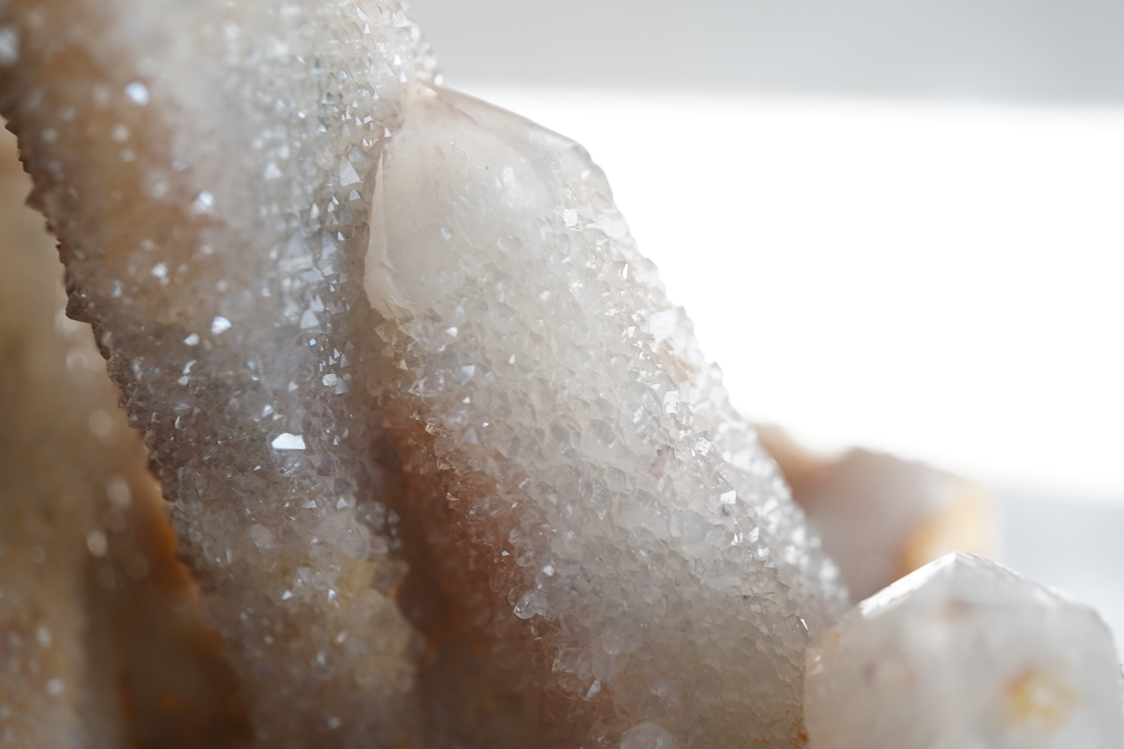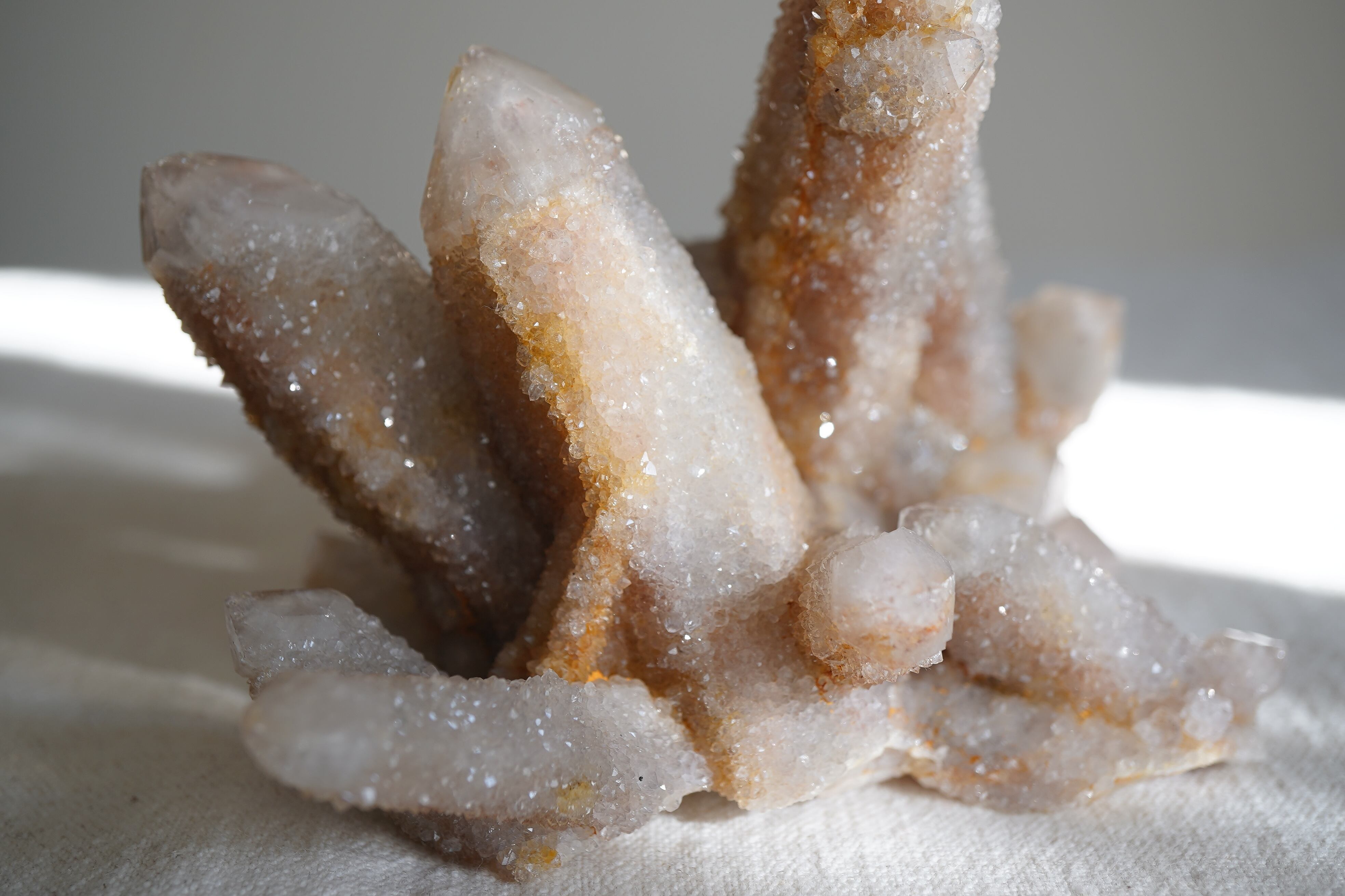 妖精のクォーツ、別名ウィッチズフィンガーとも呼ばれるとてもユニークな水晶です。水晶の表面に細かな水晶が結晶でいています。そのためお砂糖がふりかかったかのようにキラキラしています。