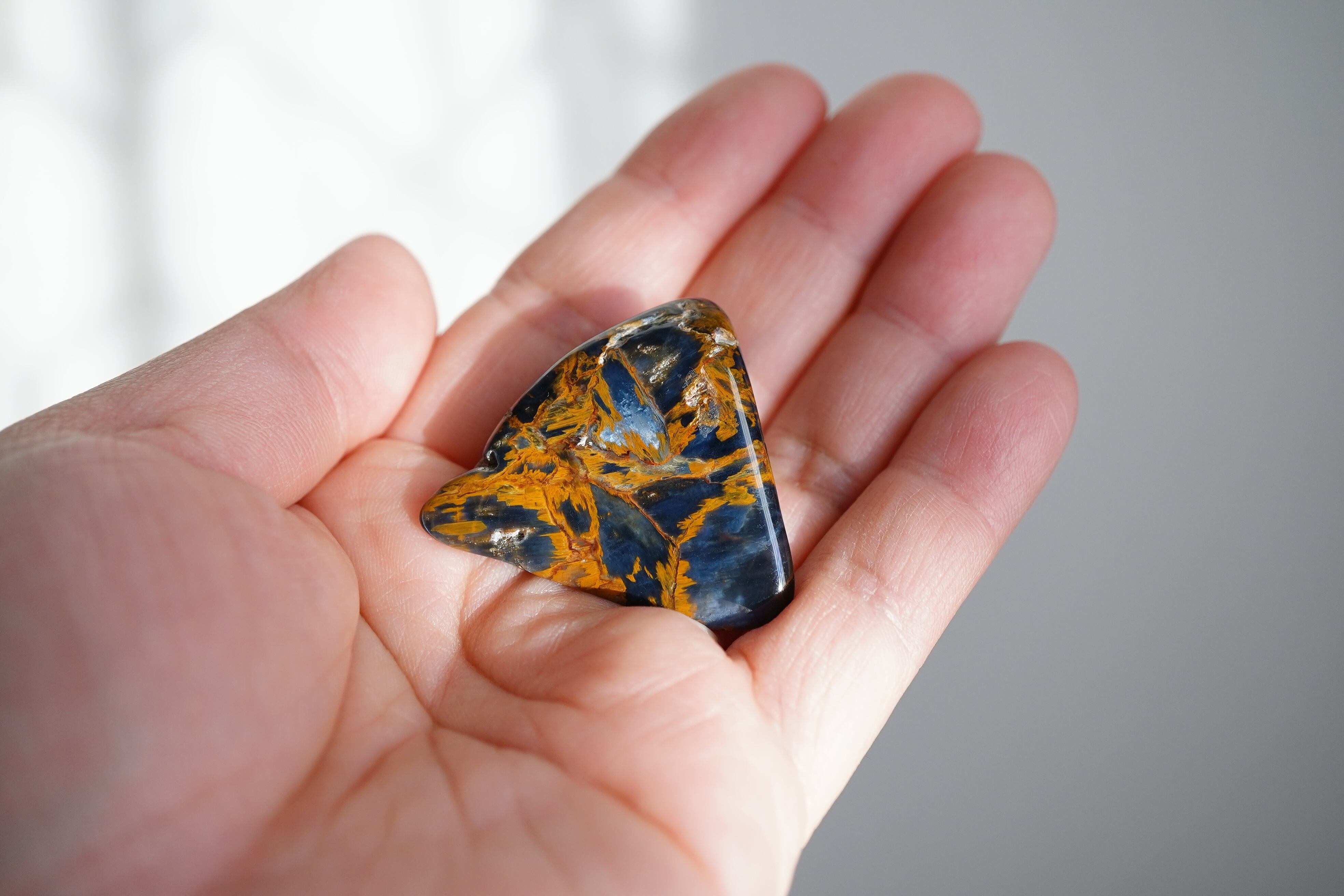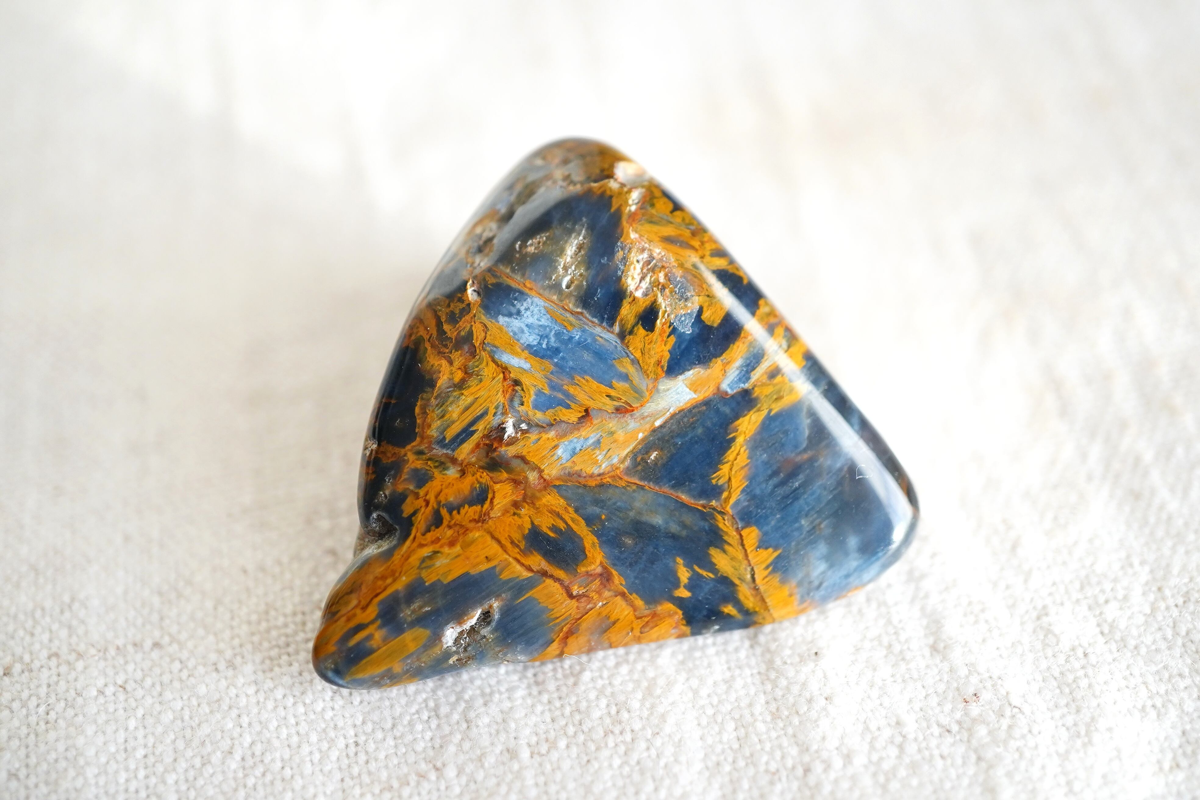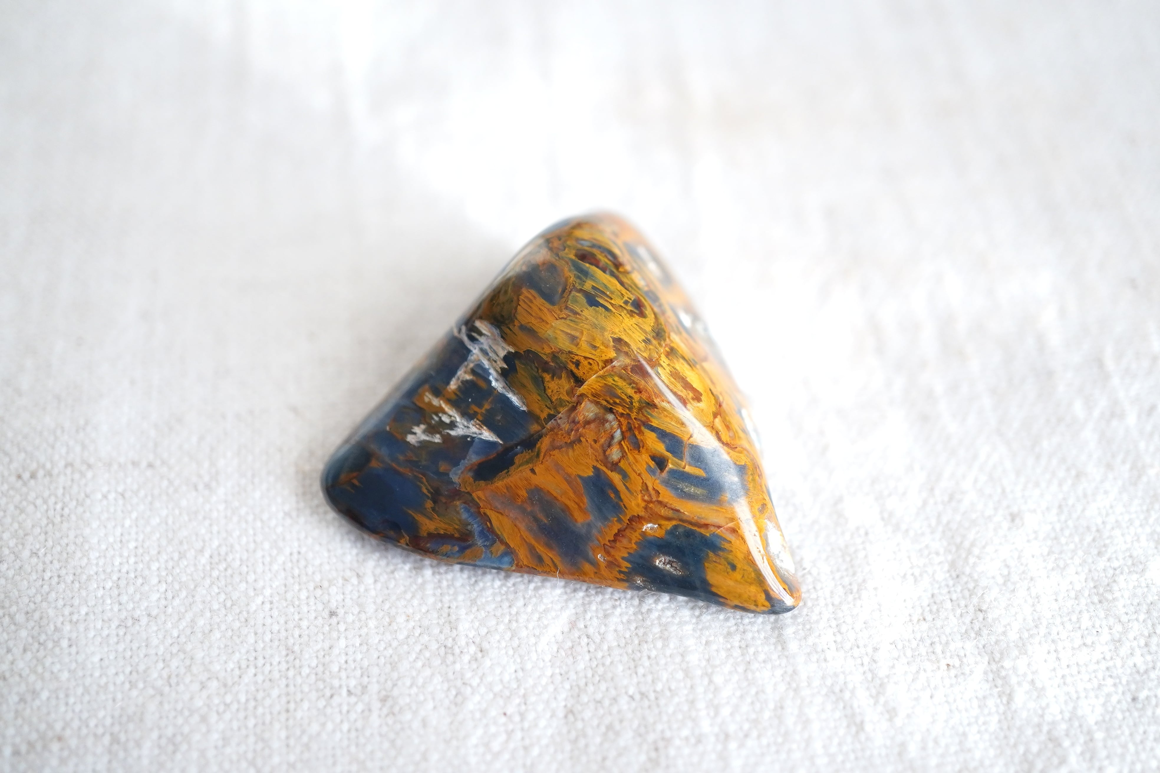 タイガーアイとホークスアイが混ざって出来上がったとても神秘的な石。ホークスアイはブルーぽいシルバー色を放っています。その間を金継ぎしたかのようにタイガーアイが縁取ります。地殻変動などでバラバラになったそれぞれの石がクォーツによって再度固められたものになります。この石を発見したシド・ピーターズ氏にちなんでピーターサイトと名付けられました。