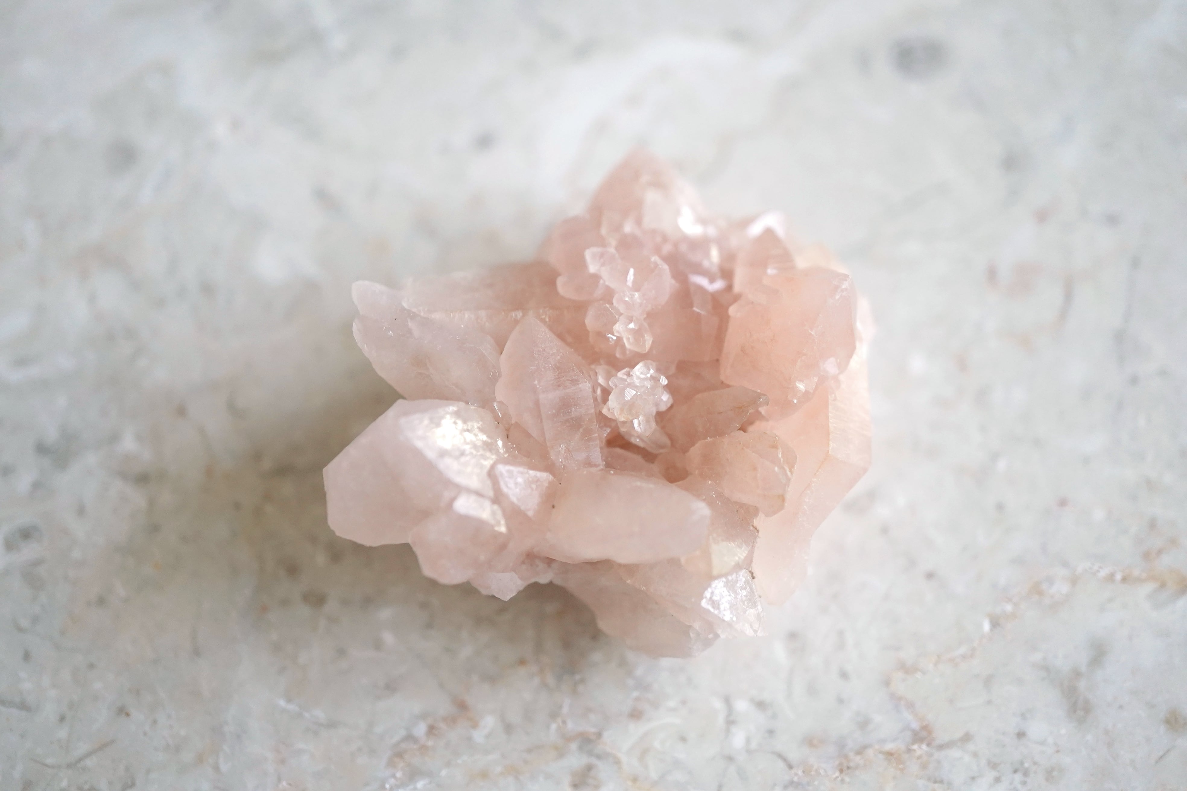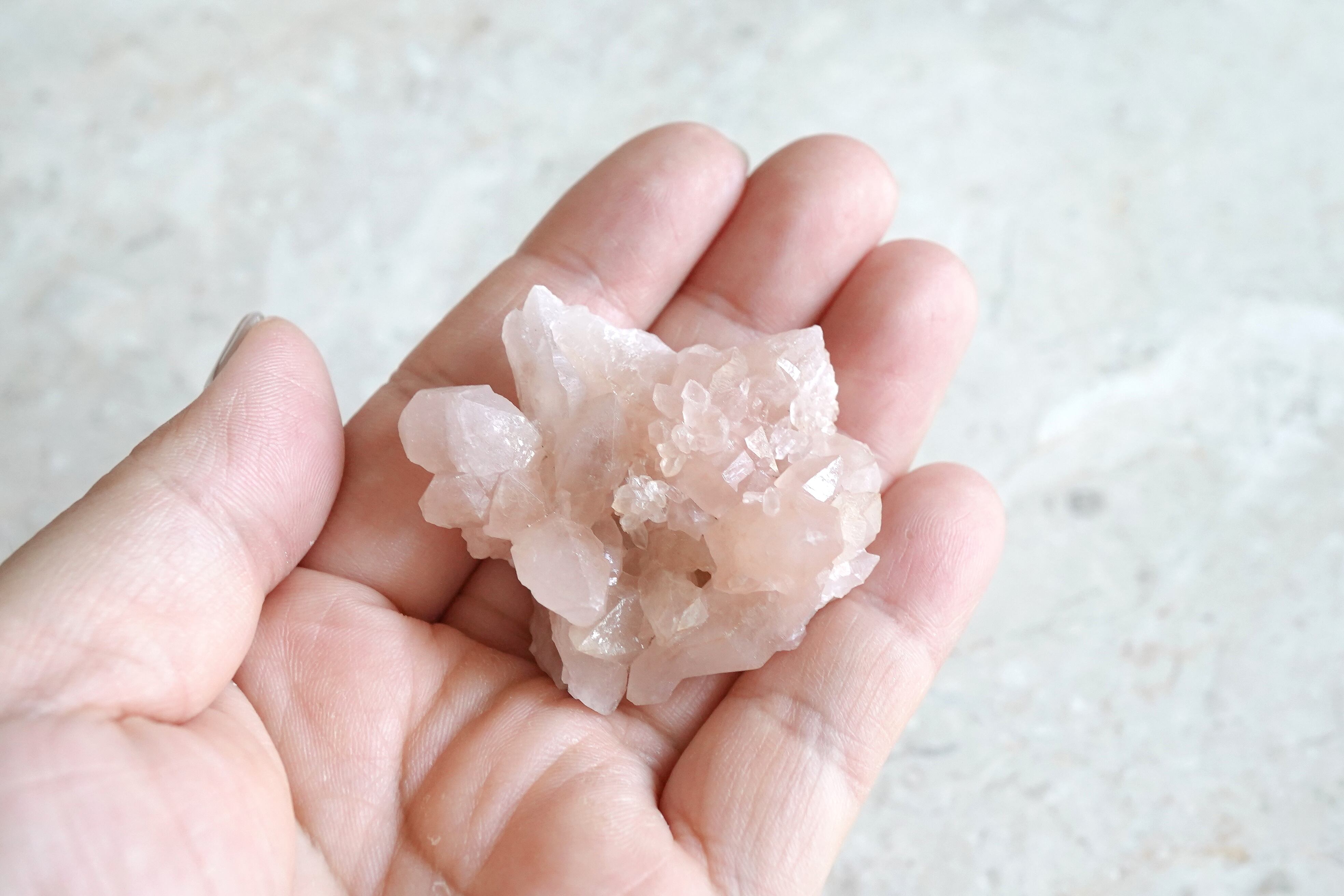 ぱっと見たらピンクアメジストに見えないのですが、よくみるとクォーツの結晶がわかります。桃色の可愛らしいピンクアメジスト。アメジストと呼ぶのに違和感すら感じるその姿。通常ジオードと呼ばれる形状での産出ですが、こちらはその周りが剥がれてクォーツのみが顕になっている状態です。