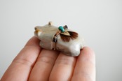 美しく念入りに彫られたフェティッシュの歴史は紀元 650 年まで遡り、伝統的な彫刻は石や鹿の角で作られています。彫刻は通常ズニ族にとって神聖な意味を持つ特定の動物や象徴の形をしています。家族代々受け継ぎ、その家族の守り神として大切にされます。精霊の宿木としても大きな意味を持つズニ族のフェティッシュです。