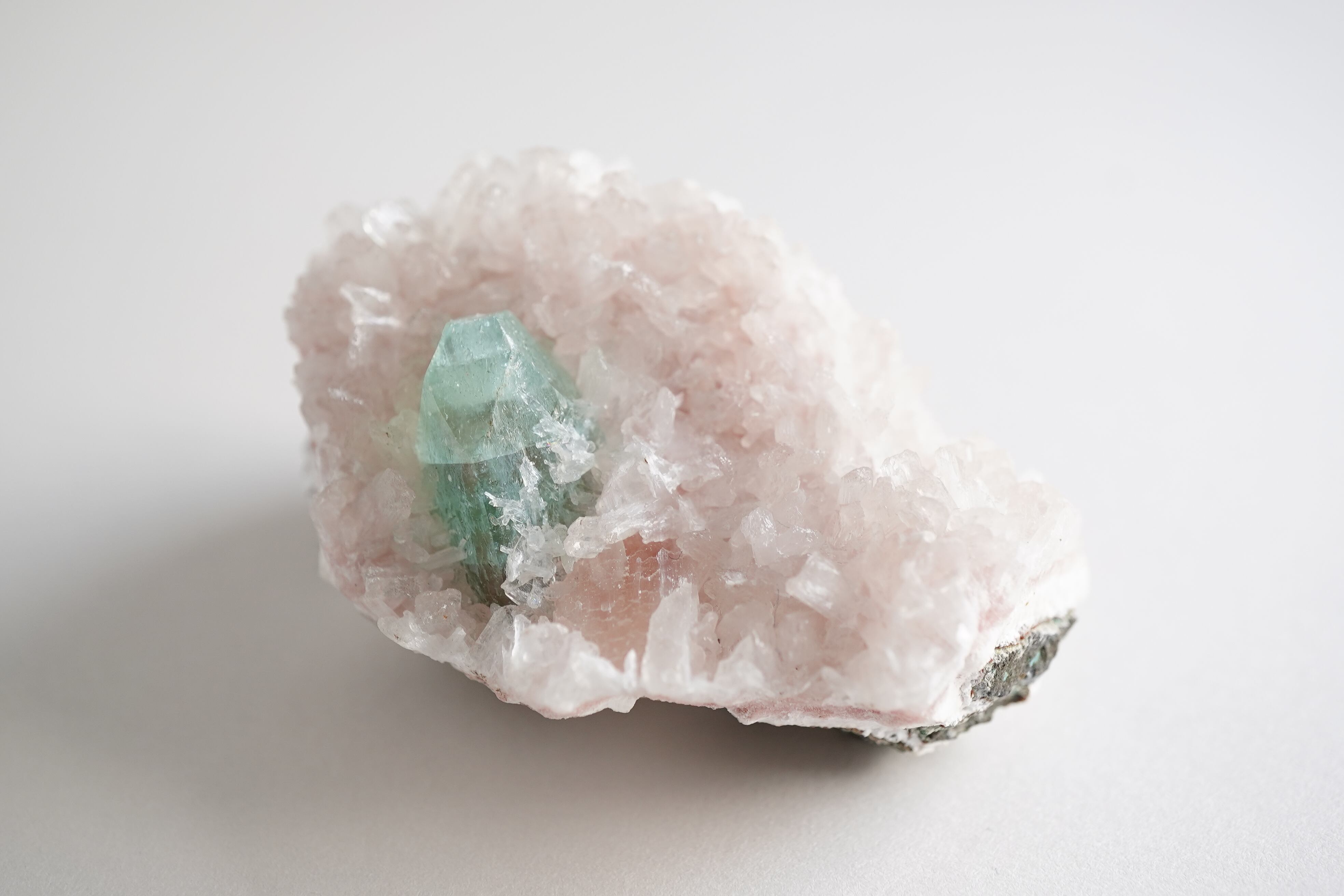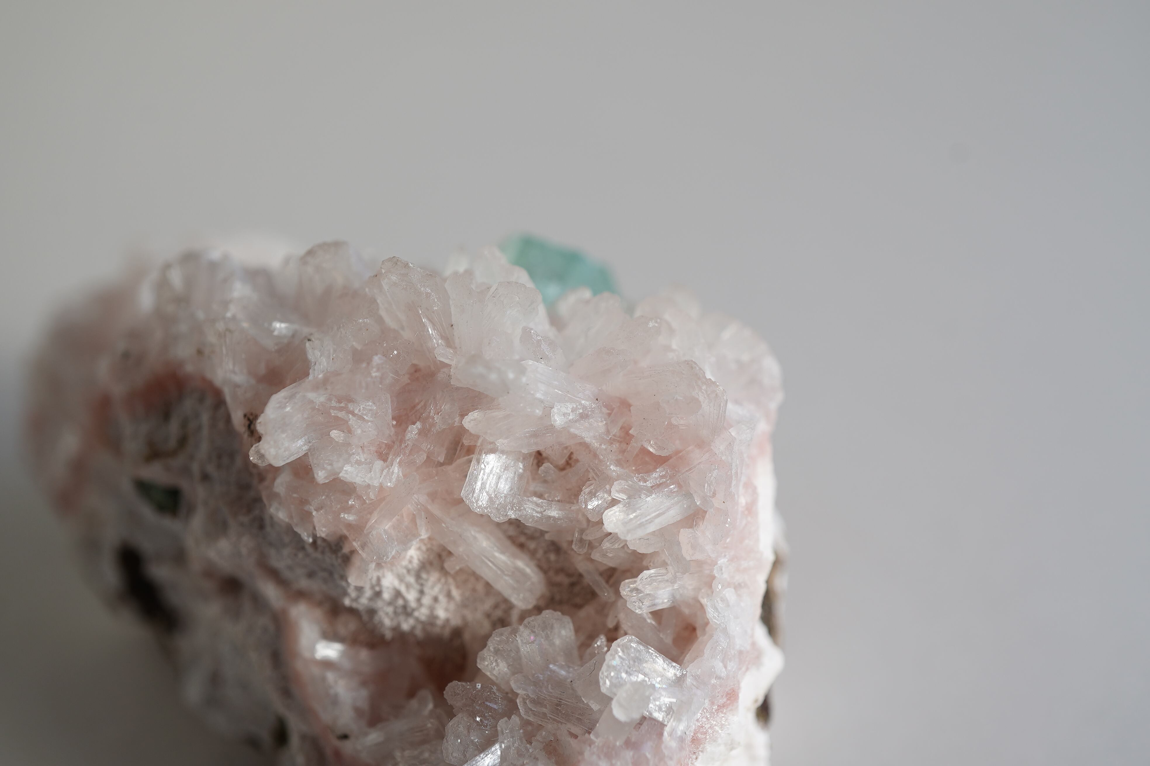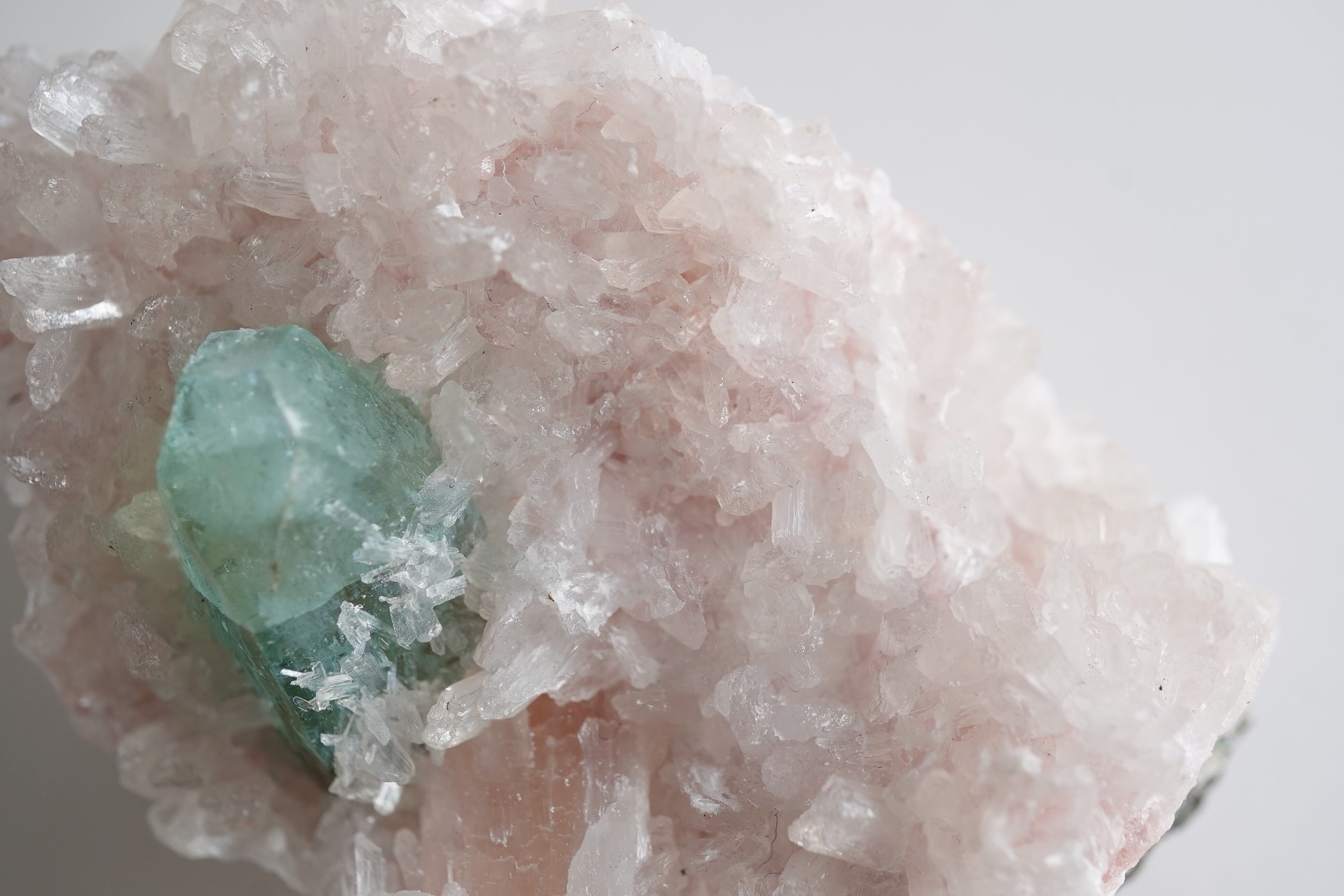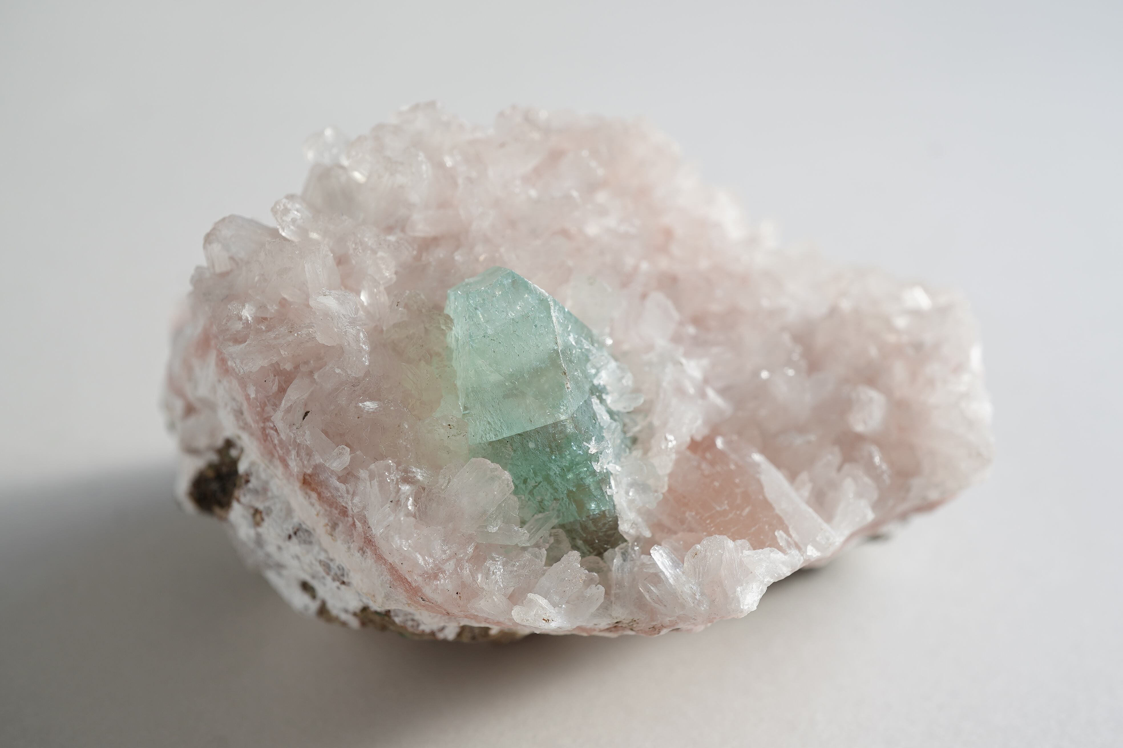 グリーンアポフィライトと淡いピンクカラーのヒューランダイト、白いスティルバイトが共生したとても希少なインド産鉱物です。グリーンアポフィライトの表面にも細かなヒューランダイトが生えています。