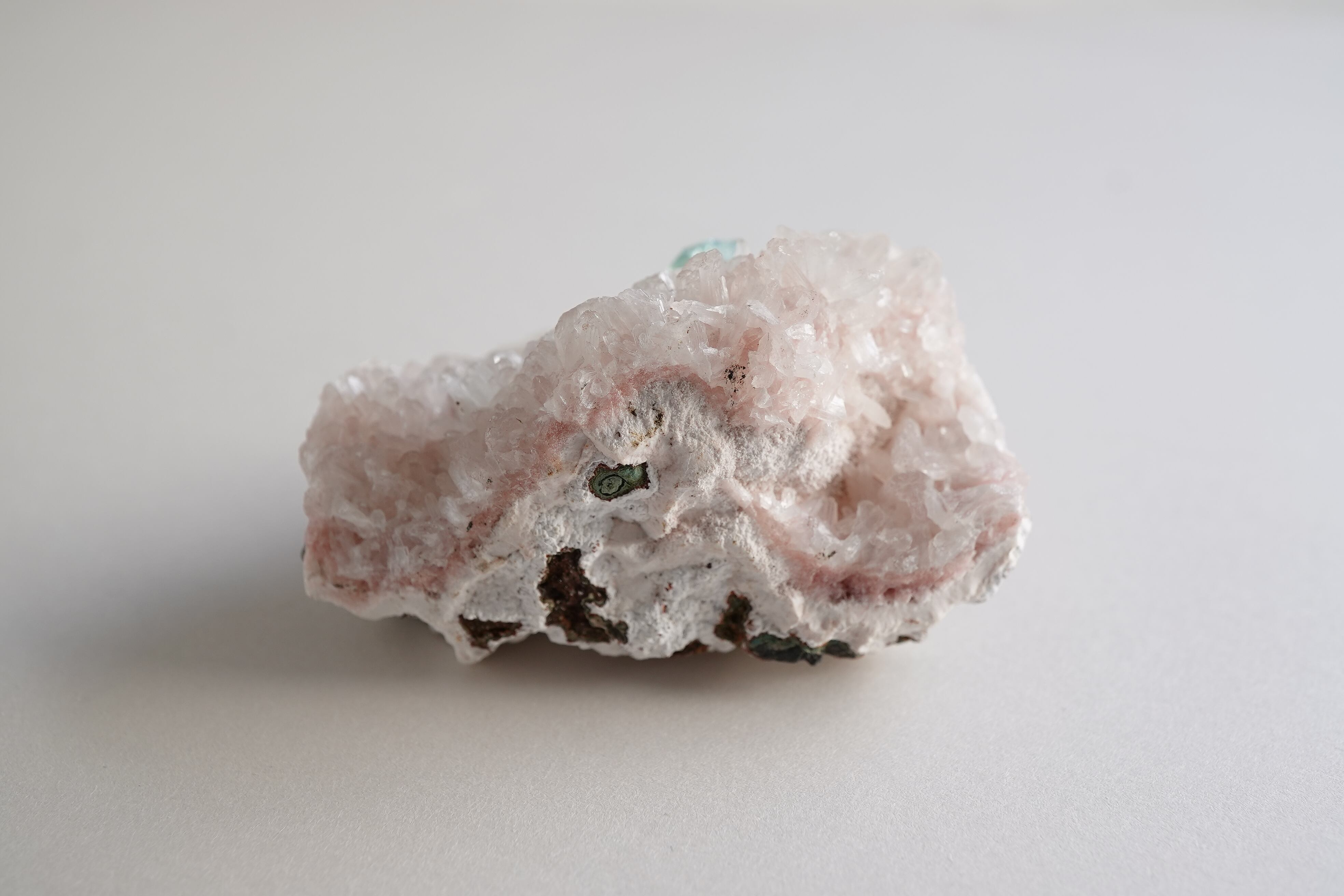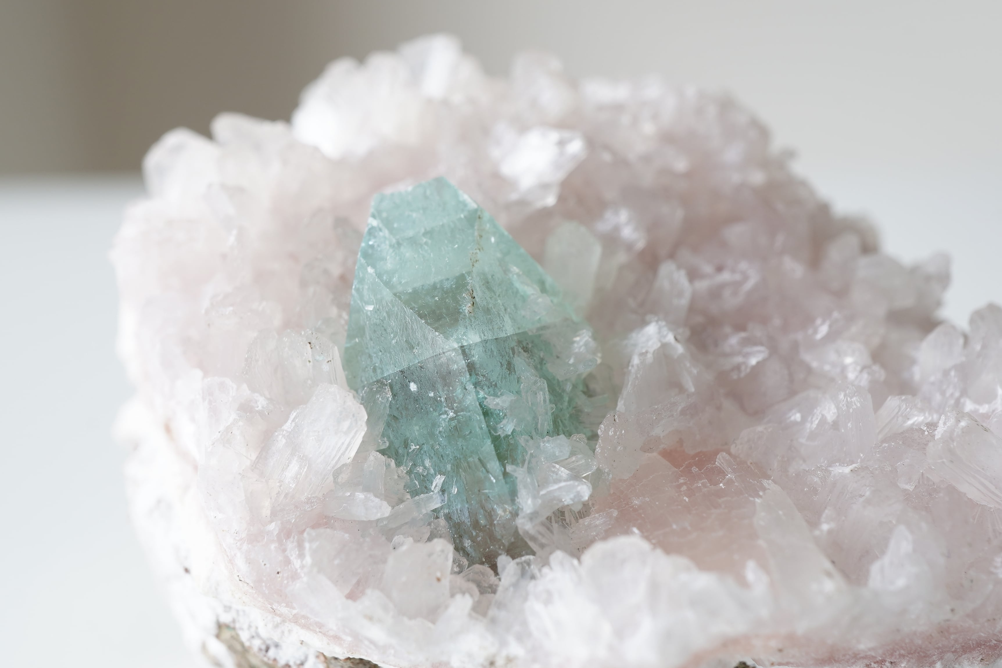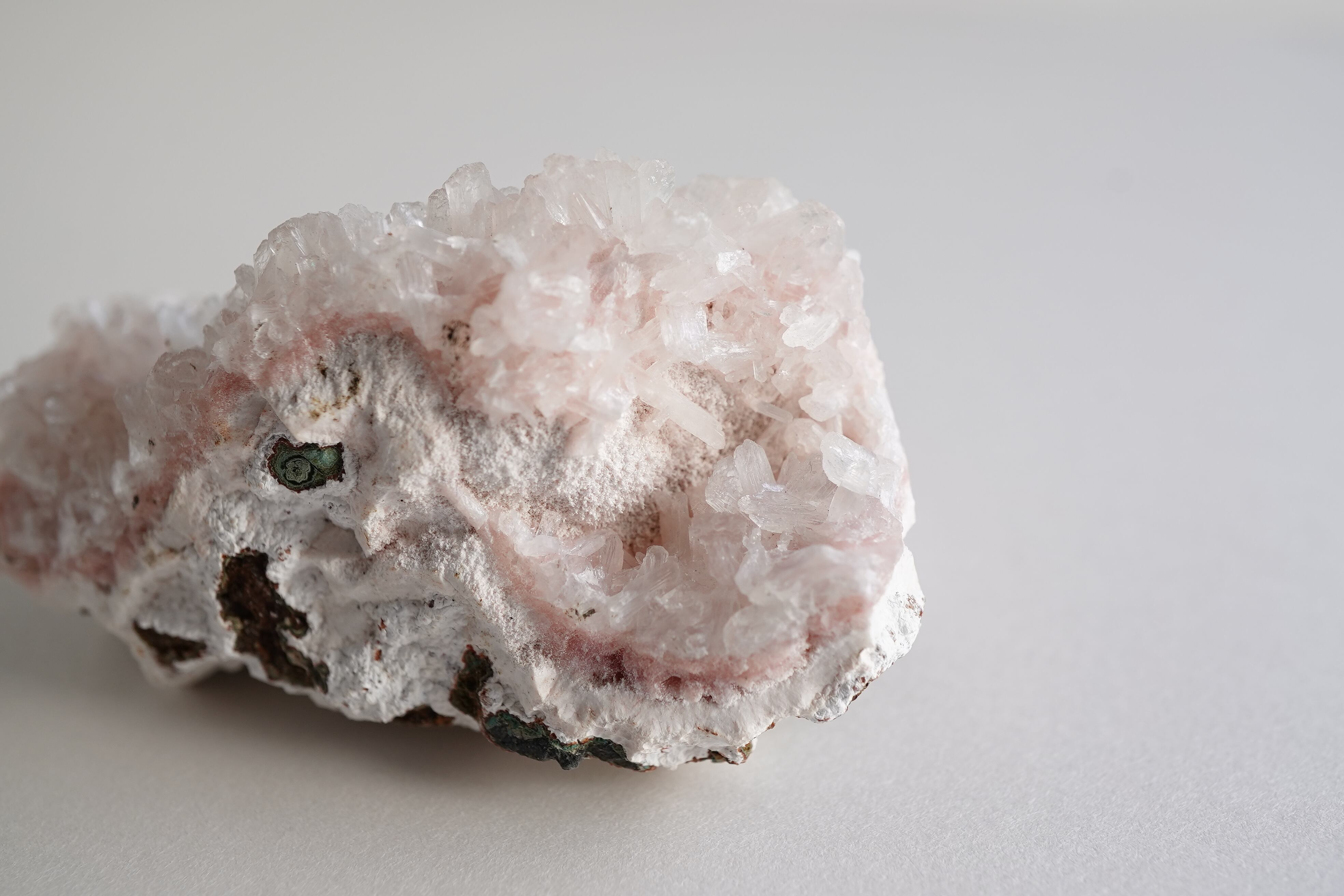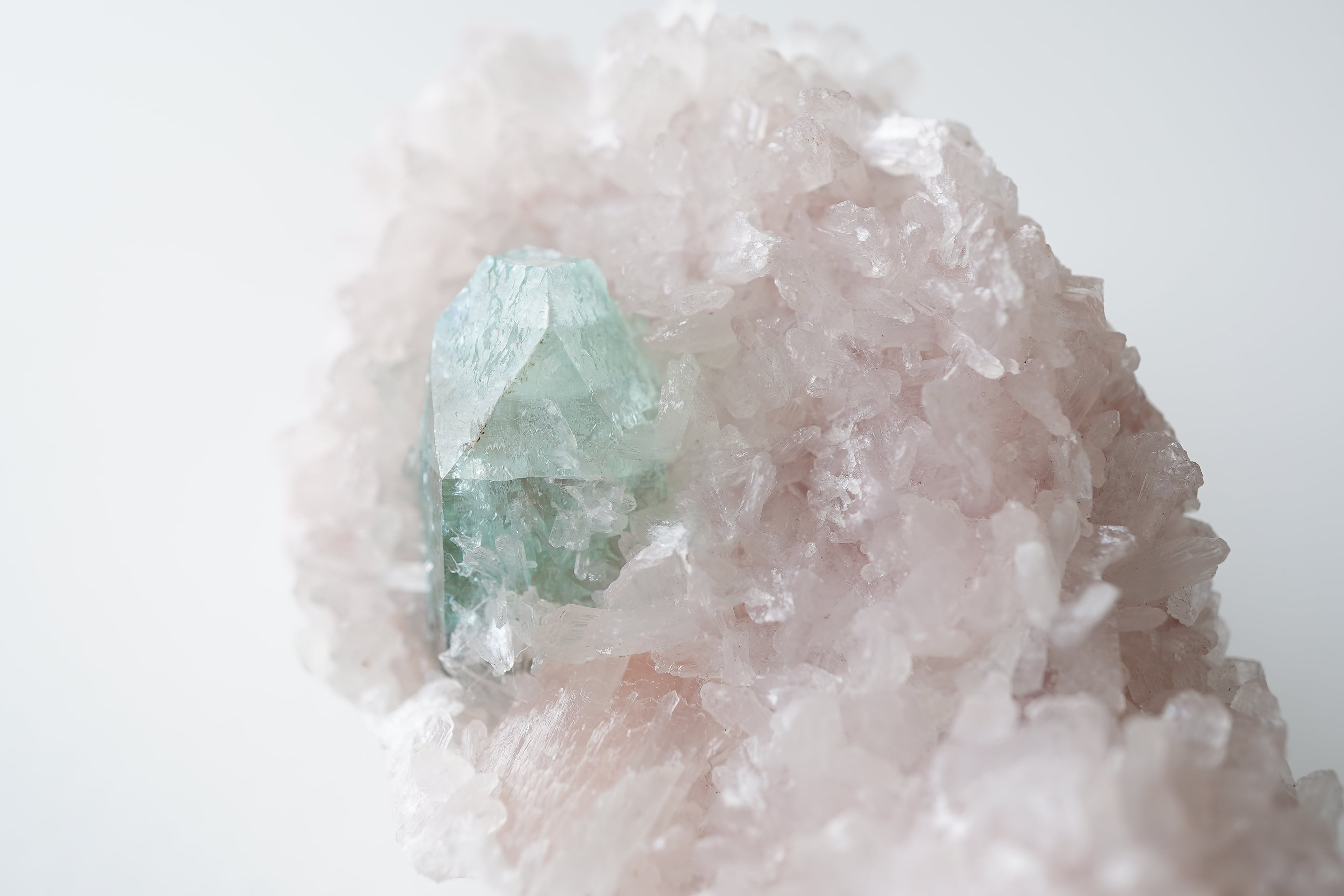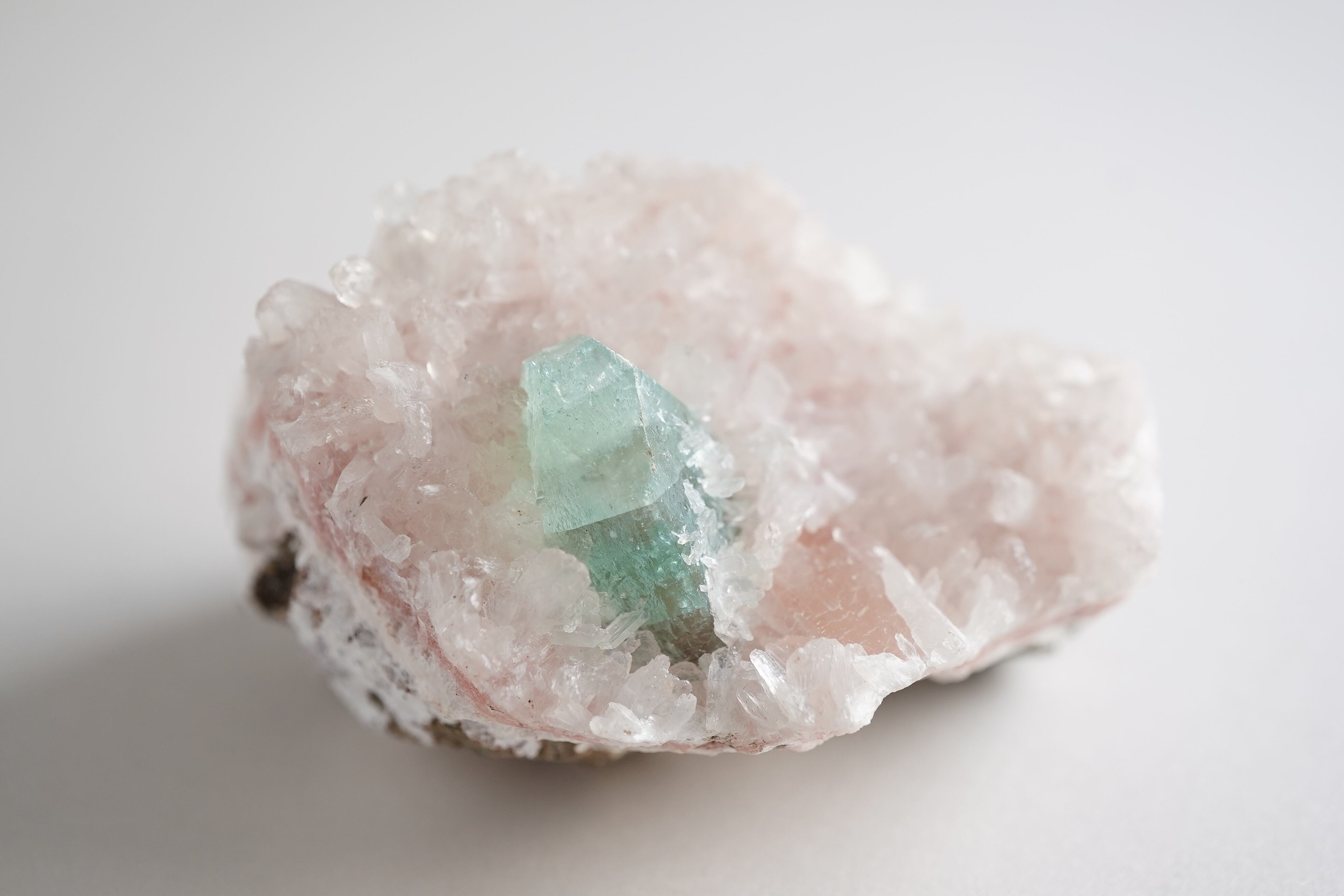 グリーンアポフィライトと淡いピンクカラーのヒューランダイト、白いスティルバイトが共生したとても希少なインド産鉱物です。グリーンアポフィライトの表面にも細かなヒューランダイトが生えています。